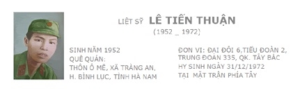 Chúng tôi là anh em Tuấn và Long, thời niên thiếu chúng tôi hay về quê nội chơi, ấn tượng với chúng tôi mãi đến bây giờ là di ảnh người chiến sỹ trẻ trên bàn thờ với đôi mắt buồn xa xôi vời vợi, đó là chú ruột của chúng tôi, liệt sỹ Lê Tiến Thuận, sinh năm 1952, quê quán tại thôn Ô Mễ-xã Tràng An-huyện Bình Lục-tỉnh Hà Nam, đơn vị C6-D2-E335, quân khu Tây Bắc, hy sinh ngày 31/12/1972 tại chiến trường Bom Lọng-Xiêng Khoảng-CHDCND Lào.